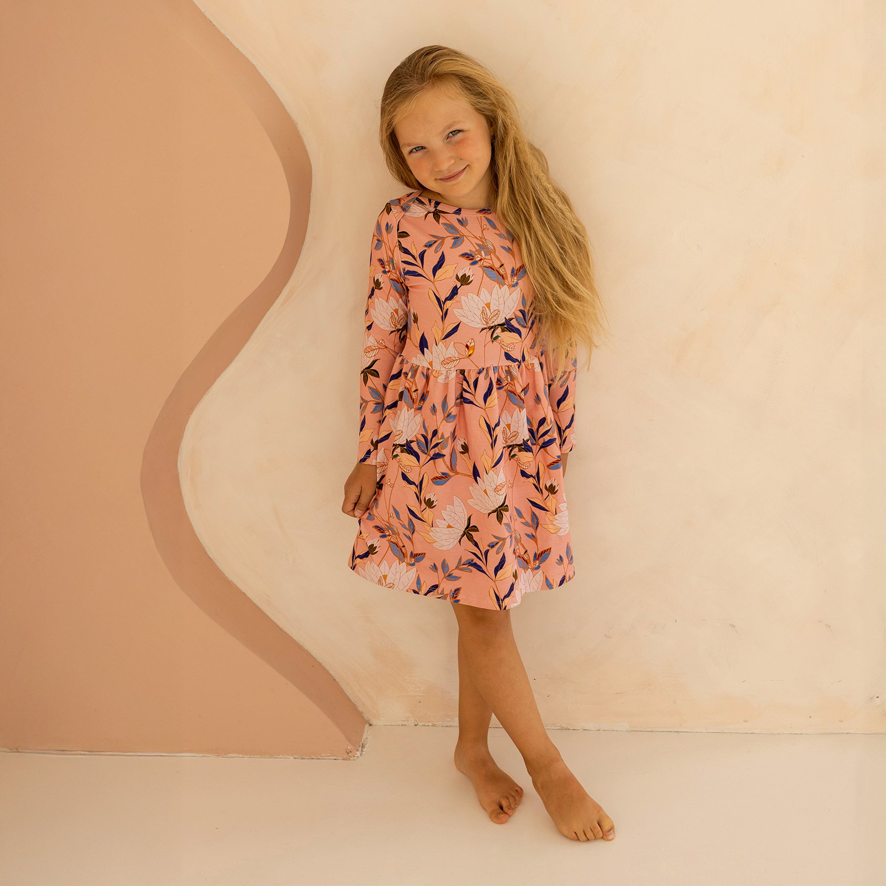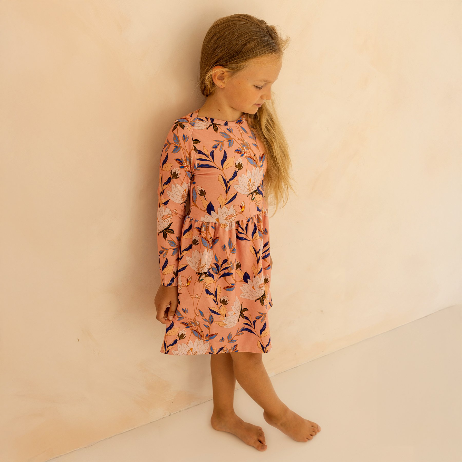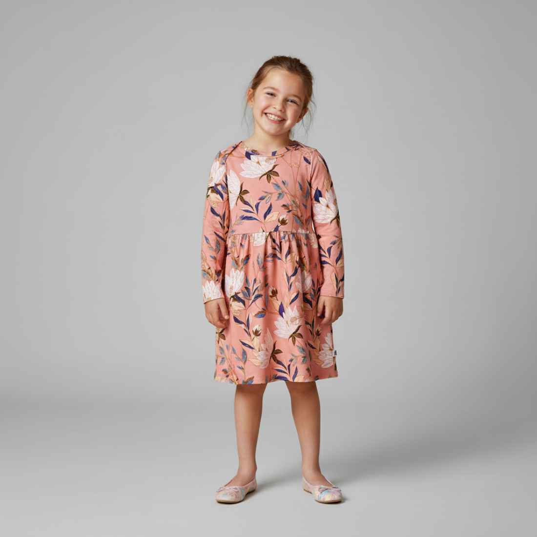 Dziewczęca sukienka z długim rękawem. Uszyta w Polsce, z wysokiej jakości bawełny. Jest miękka, elastyczna, przewiewna i niezwykle wygodna, dzięki czemu dziewczęta chętnie będą wybierały ją nie tylko do stylizacji świątecznych, ale też na co dzień.