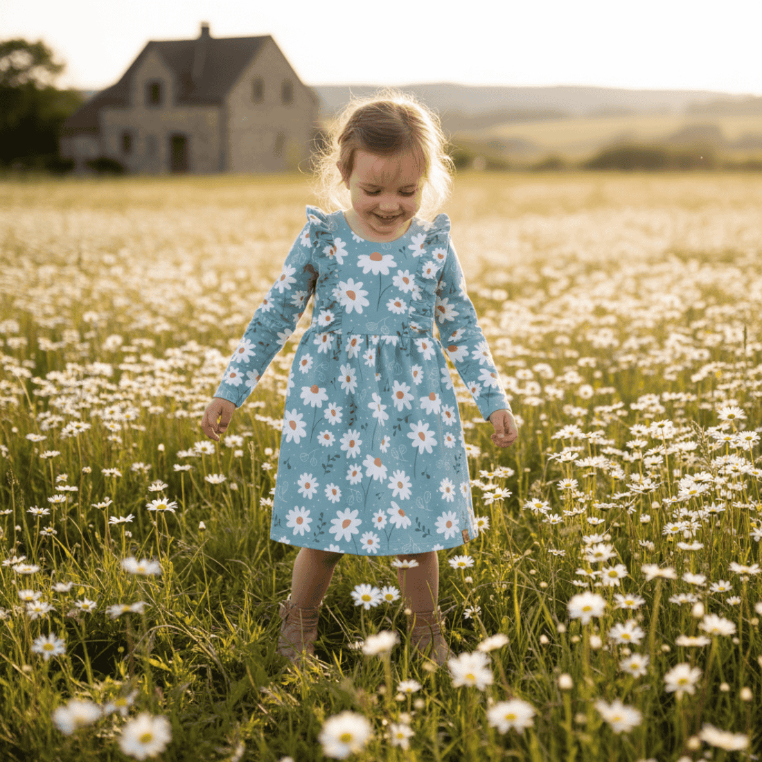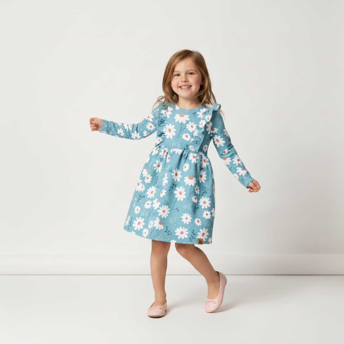 Pastelowa sukienka dziewczęca w kwiaty. Uszyta w polskiej szwalni, z najwyższej jakości bawełny, jest przyjemna w dotyku, elastyczna, bardzo wygodna, a przy tym trwała.
