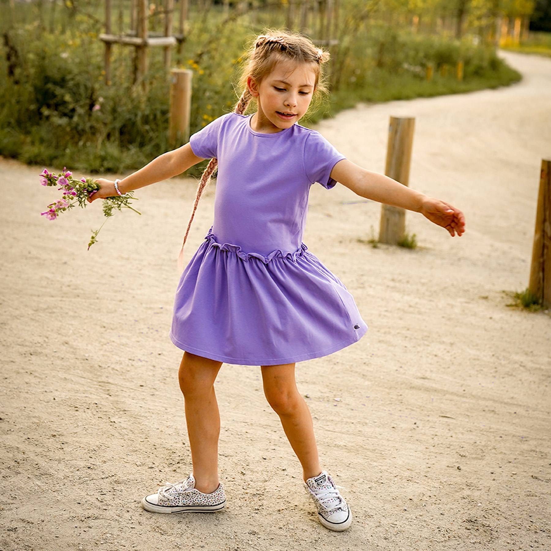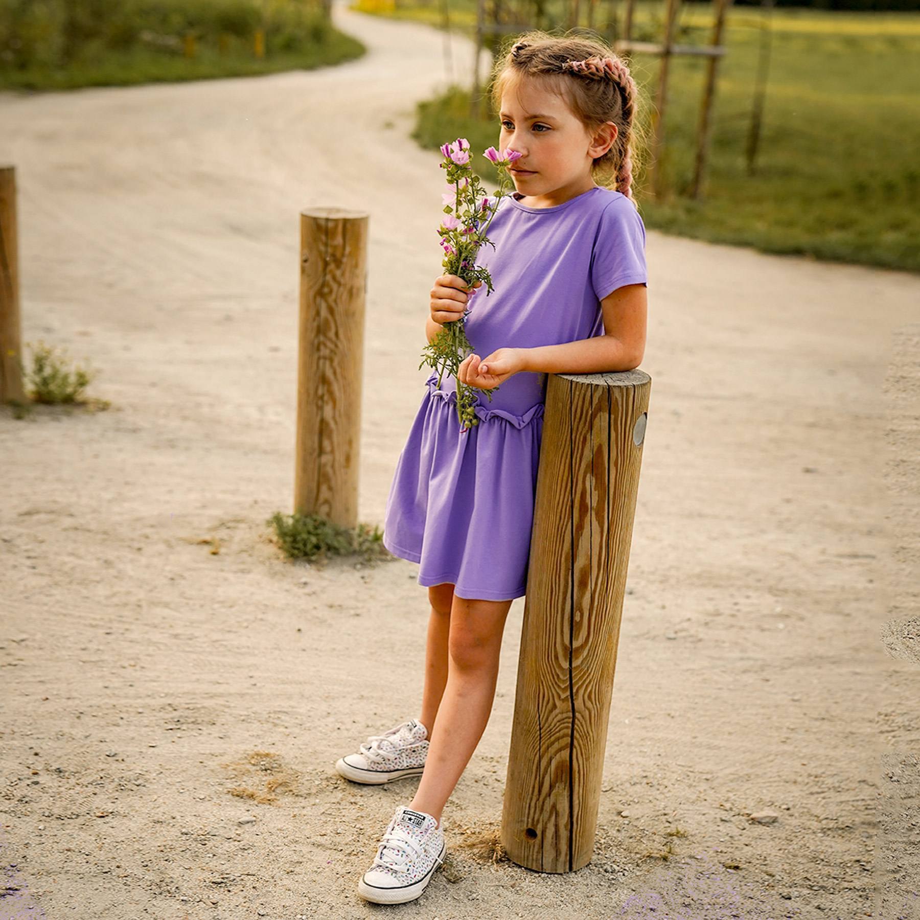 Letnia sukienka z krótkim rękawkiem. Uszyta w Polsce, z najwyższej jakości bawełny. Bardzo miękka, przewiewna i elastyczna. Zapewnia użytkowniczce komfort termiczny i wygodę na najwyższym poziomie, nawet podczas letnich upałów. Sukienka ma dopasowaną górę i okrągły dekolt. Rozkloszowany dół został naszyty na zewnątrz i wykończony efektowną falbanką, która stanowi charakterystyczną cechę tego modelu. Sukienka w jednolitym, kolorze idealnie wpisuje się w lekką, dziewczęcą garderobę. Na pewno będzie chętnie wybierana na długie, letnie dni pełne przygód.
