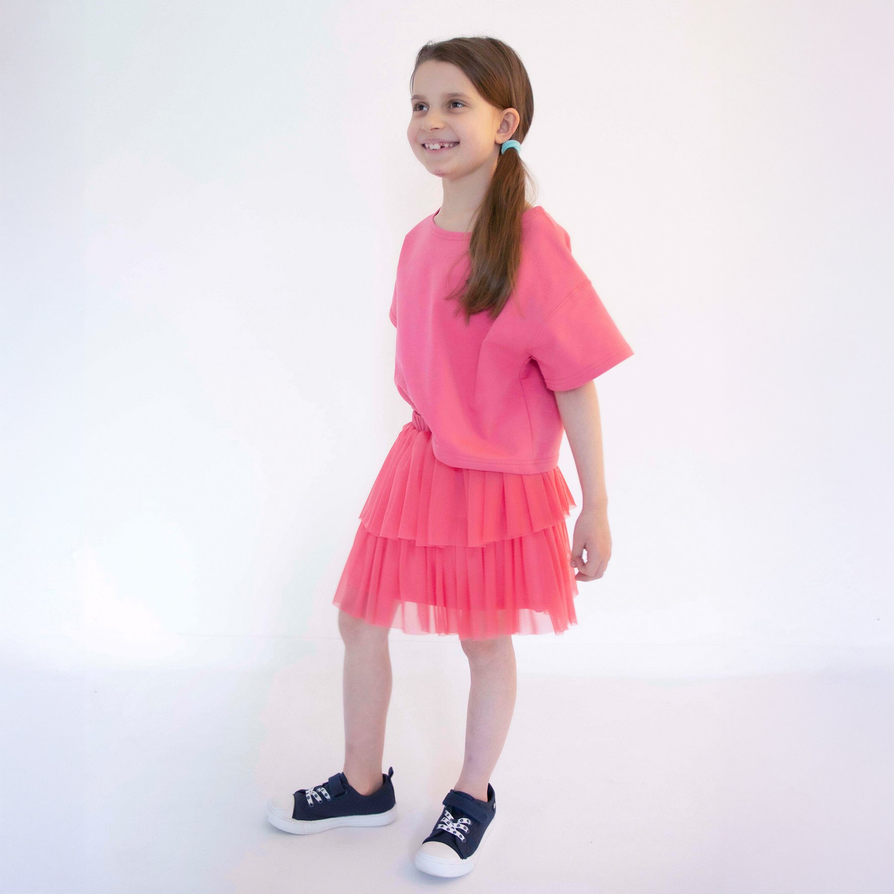 Uroczy komplet niemowlęcy to idealny wybór na codzienne chwile pełne zabawy. Zestaw składa się z krótkiego, miękkiego t-shirta oraz różowej spódnicy z falbankami, wykonanej z miękkiego materiału . Elastyczna talia zapewniają wygodne dopasowanie i swobodę ruchów. Całość tworzy stylową, a jednocześnie wygodną stylizację dla małej dziewczynki, idealną na spacer, rodzinne spotkanie czy sesję zdjęciową.