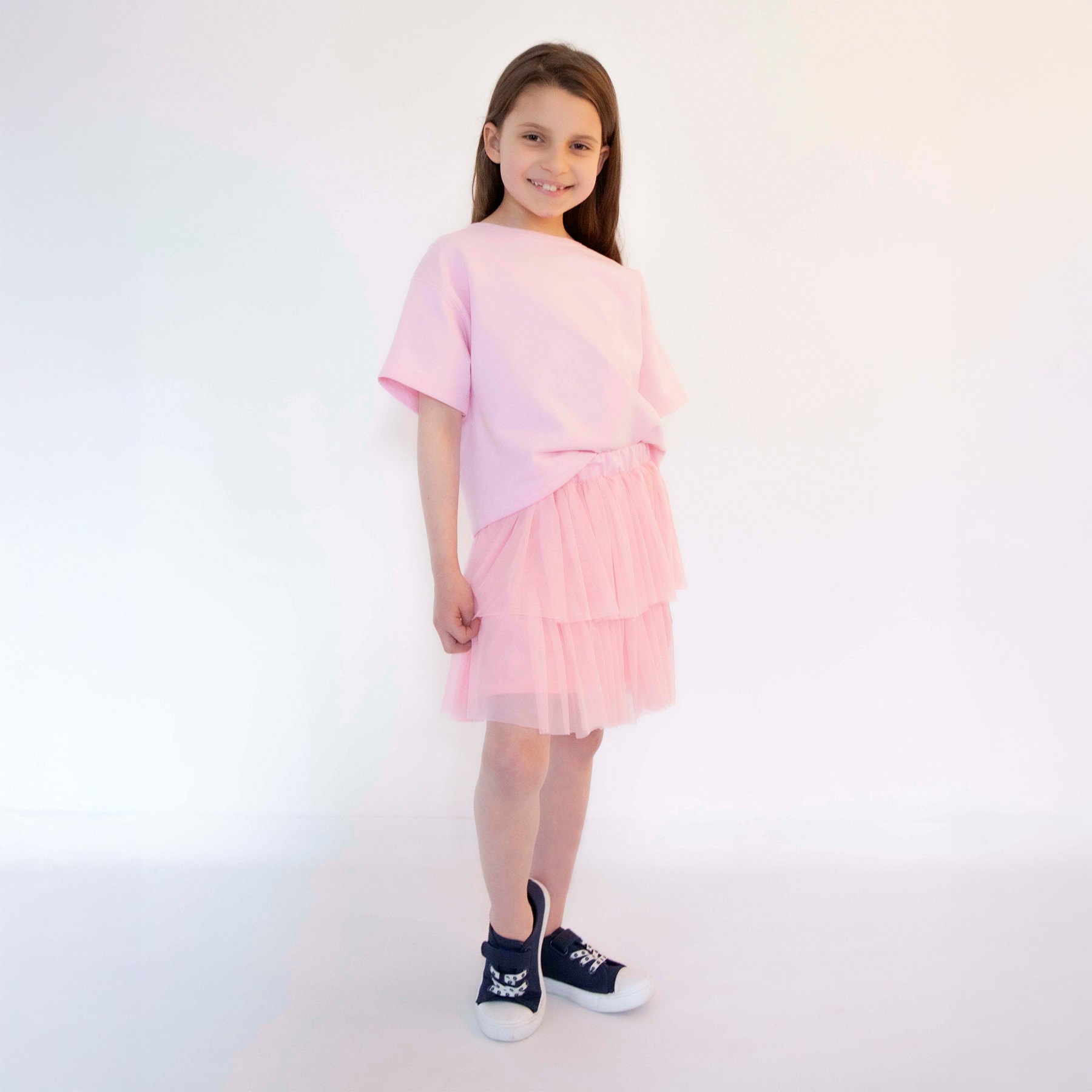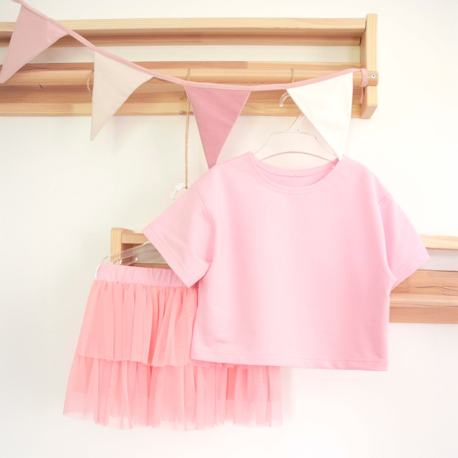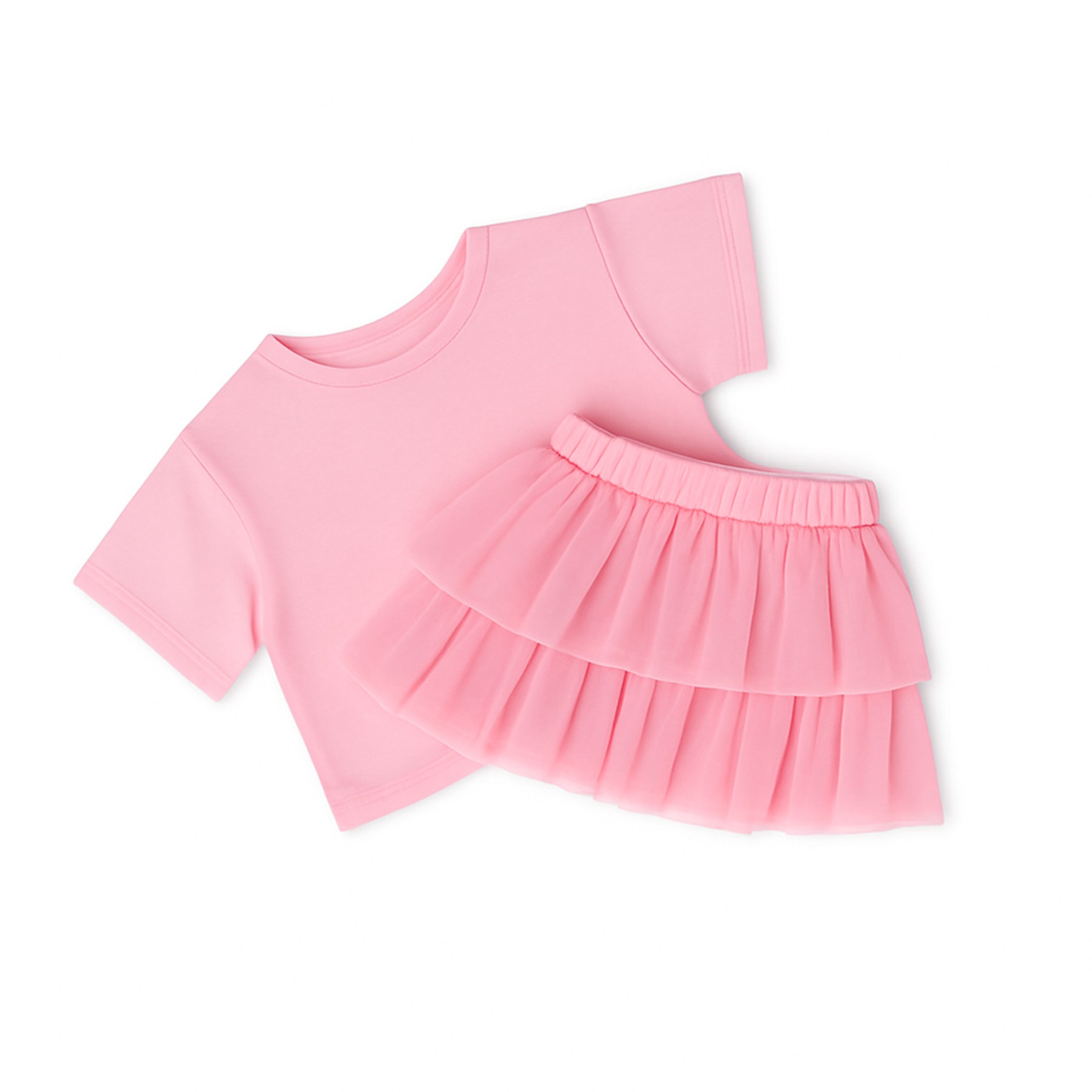 Uroczy komplet niemowlęcy to idealny wybór na codzienne chwile pełne zabawy. Zestaw składa się z krótkiego, miękkiego t-shirta oraz różowej spódnicy z falbankami, wykonanej z miękkiego materiału . Elastyczna talia zapewniają wygodne dopasowanie i swobodę ruchów. Całość tworzy stylową, a jednocześnie wygodną stylizację dla małej dziewczynki, idealną na spacer, rodzinne spotkanie czy sesję zdjęciową.