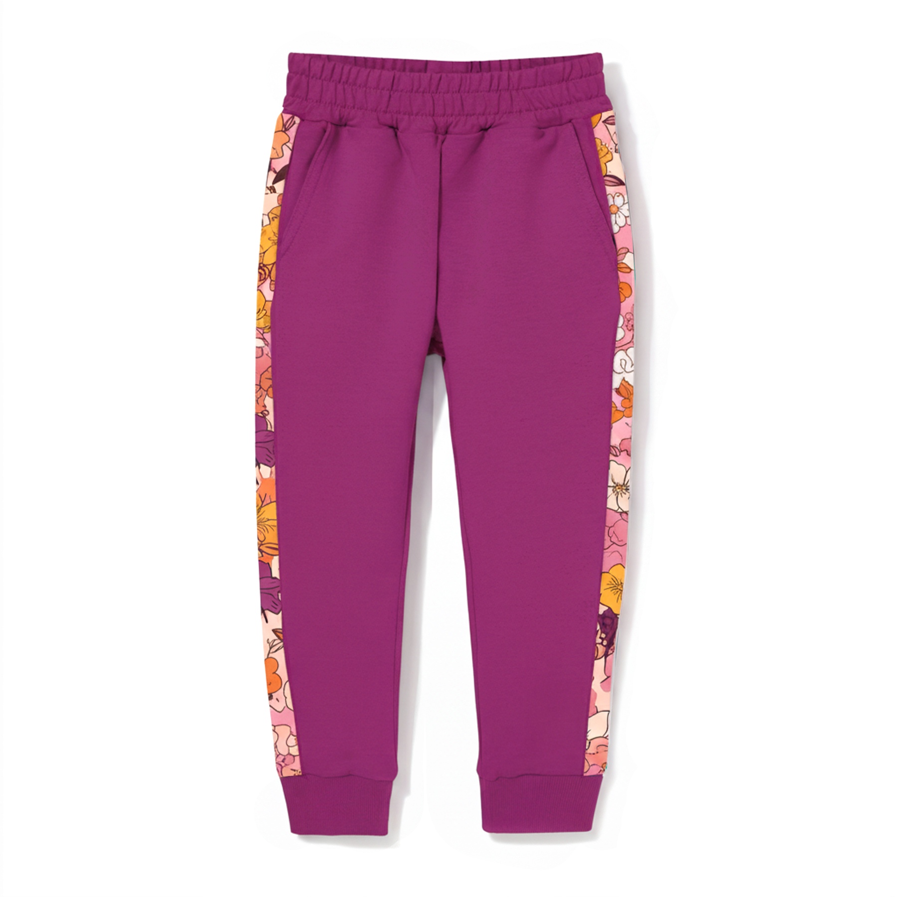 Nie zapominajmy też o kolorystyce. Piękny odcień fioletu został nieco rozjaśniony kwiatowym lampasem z pomarańczowymi tonami. Takie zestawienie idealnie wpisuje się w dziewczęcą garderobę.