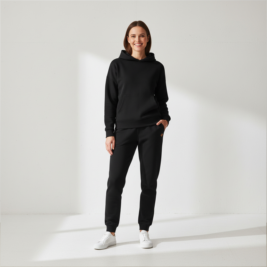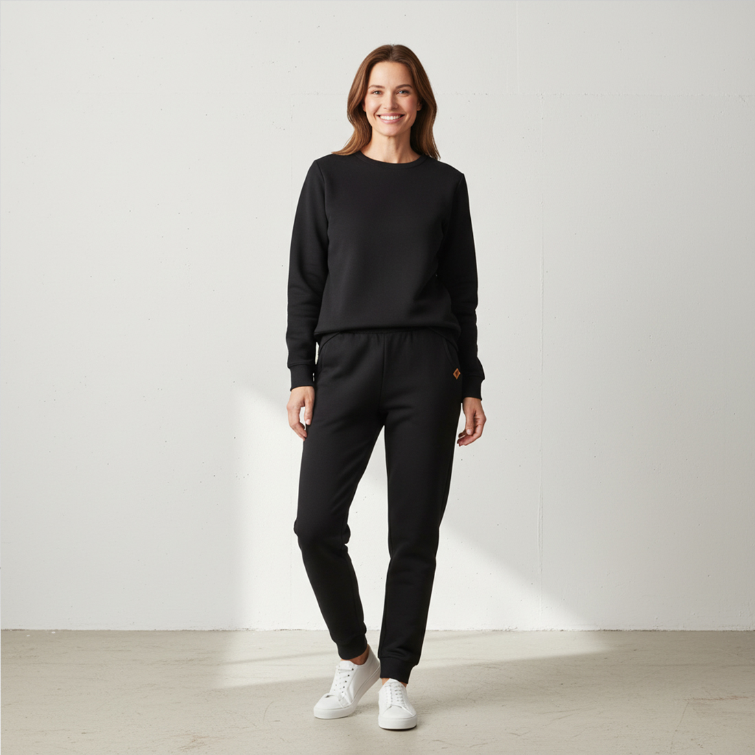 Czarne spodnie dresowe to klasyka w nowoczesnym wydaniu — idealne solo lub jako część kompletów. Uszyte z wysokogatunkowej bawełny z dodatkiem elastanu, zapewniają komfort, elastyczność i trwałość użytkowania.