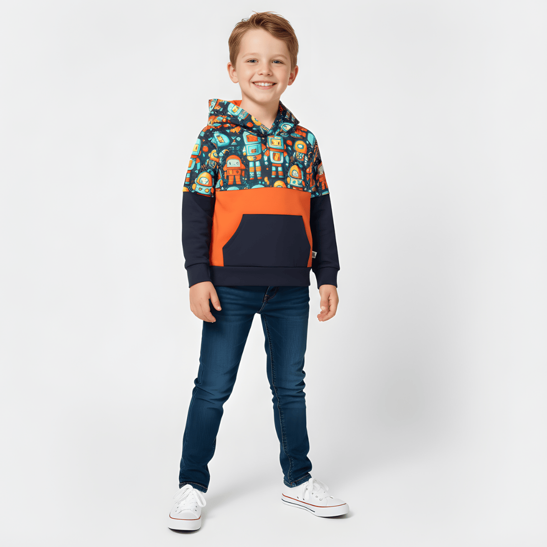 Bluza jest miękka, ciepła i bardzo wygodna. Ma kaptur oraz dużą kieszeń kangurkę – idealną na drobiazgi lub ogrzanie rąk. Uszyta z wysokiej jakości bawełny z elastanem – świetnie znosi codzienne zabawy i pranie. Granatowy kolor jest praktyczny i pasuje do wszystkiego.