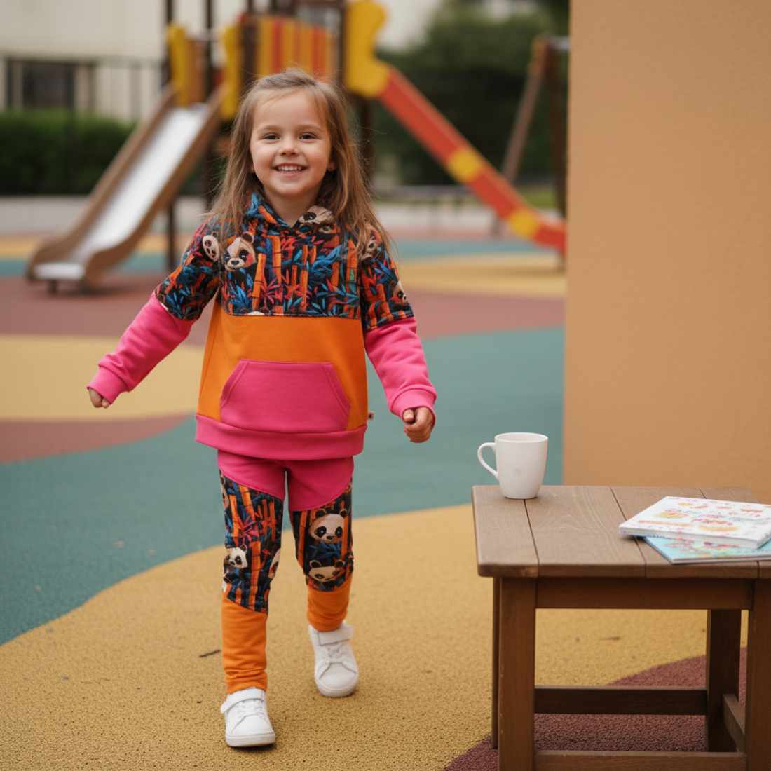 Legginsy w połączeniu z pomarańczową bluzą z tym samym wzorem stworzą wesoły, energetyczny zestaw, który sprawdzi się w szkole, przedszkolu i podczas innych codziennych aktywności.