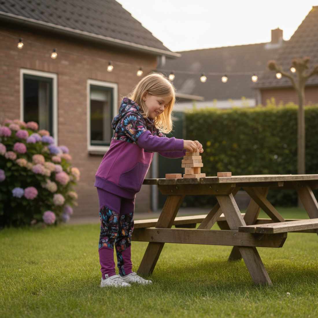 W połączeniu z fioletową bluzą z tej samej kolekcji tworzą wyjątkowo radosny komplet.