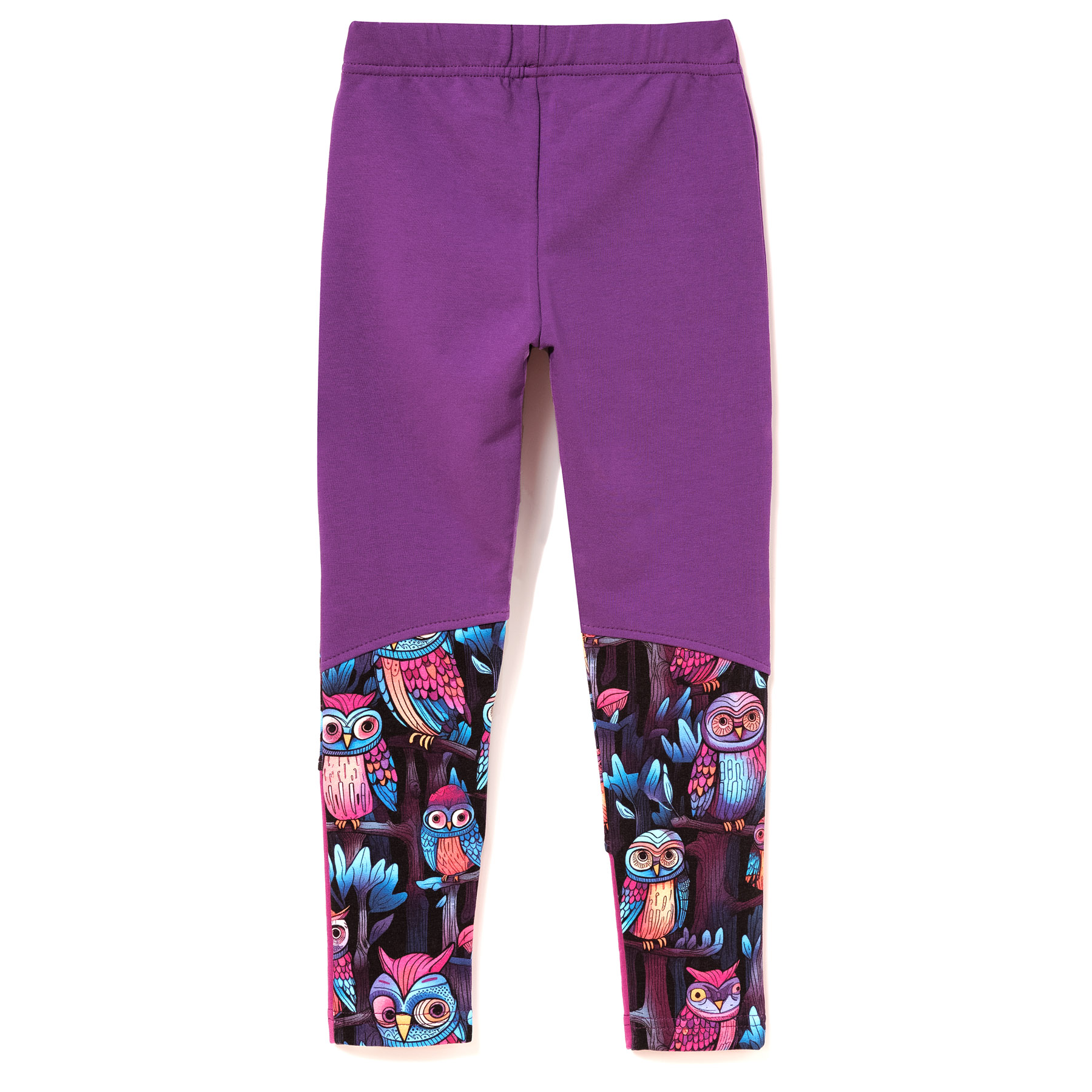 Fioletowe legginsy w kolorowe sowy to idealna propozycja dla dziewczynek, które lubią wygodę i oryginalne wzory.