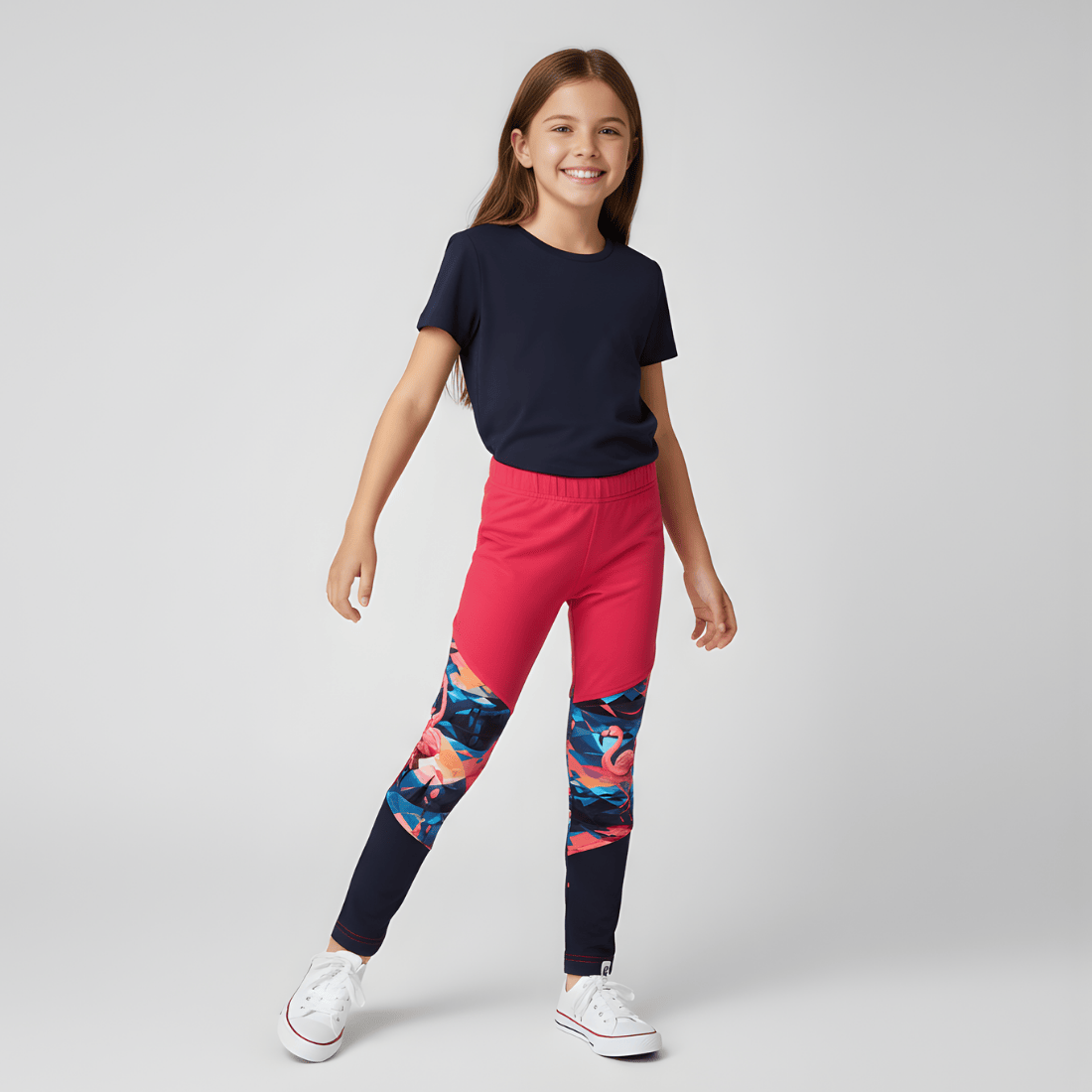 Stylowe i wygodne – granatowe legginsy z różowymi flamingami to klasyk w dziewczęcym wydaniu.
