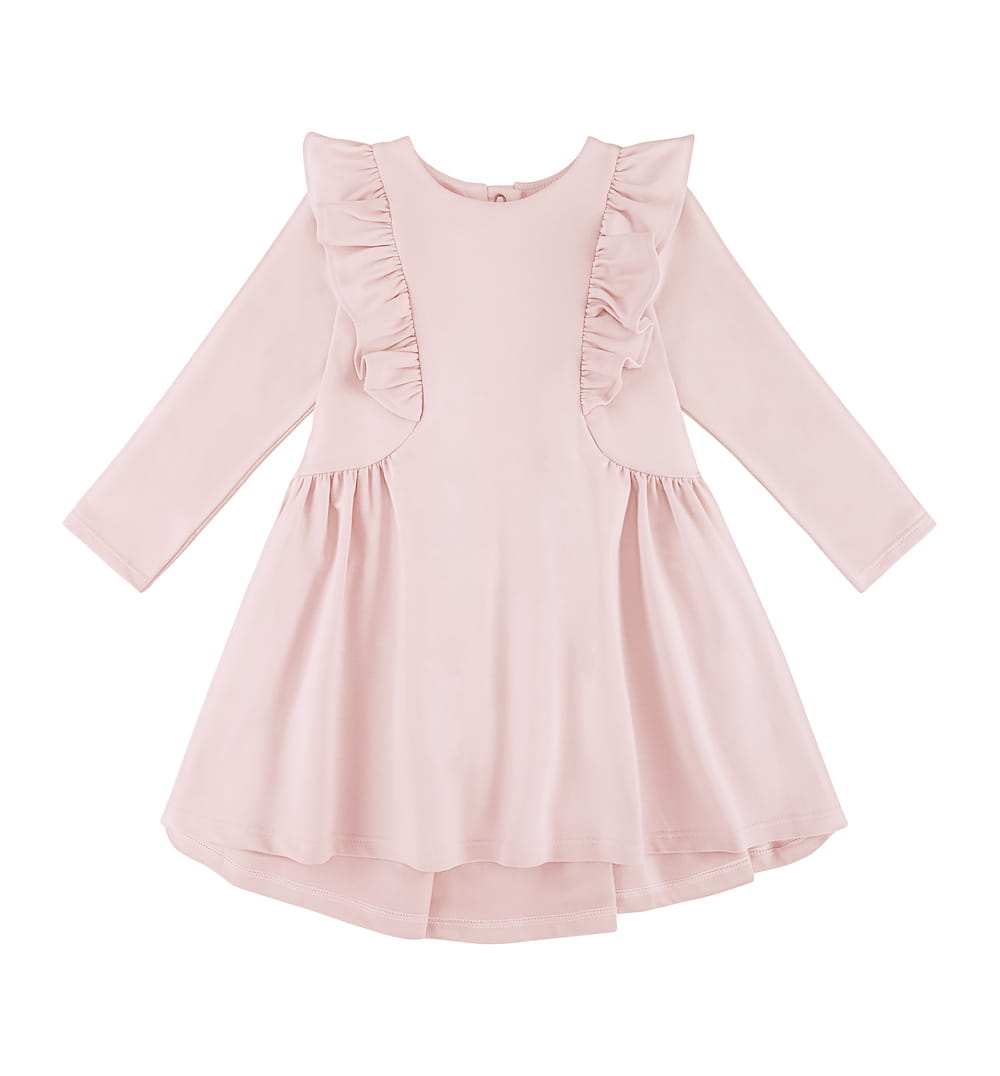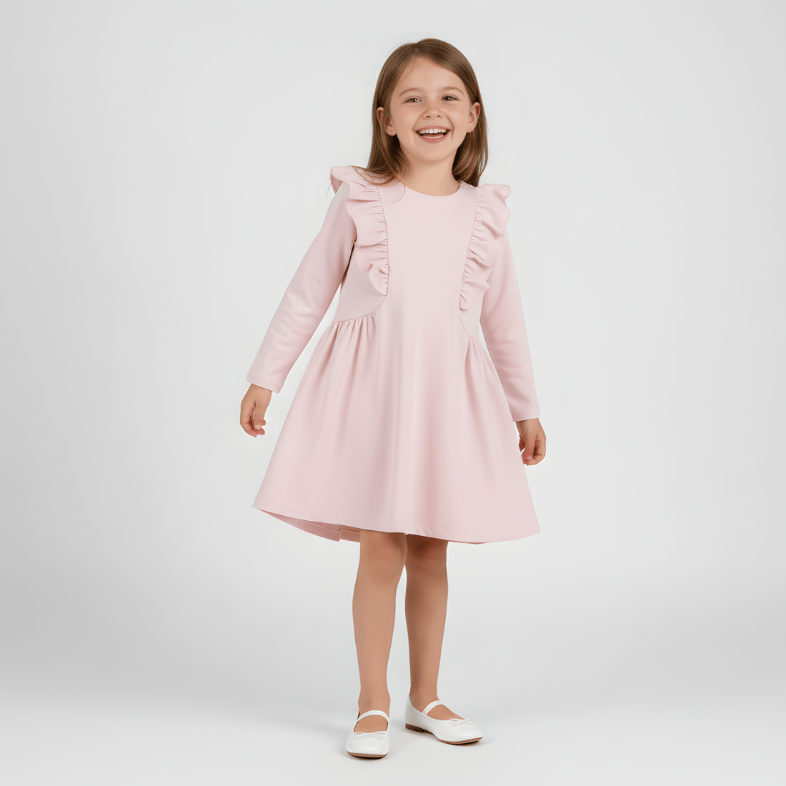 Sukienka dziewczęca w pięknym odcieniu pudrowego różu, ze skrzydełkami, to propozycja pełna delikatności i dziewczęcego uroku. Model ma długi rękaw, dzięki czemu świetnie sprawdzi się przez cały rok — zarówno jesienią, zimą, jak i wiosną. Uszyta z miękkiej, przyjemnej dla skóry bawełny, zapewnia wygodę podczas zabawy, spacerów i codziennych aktywności.
