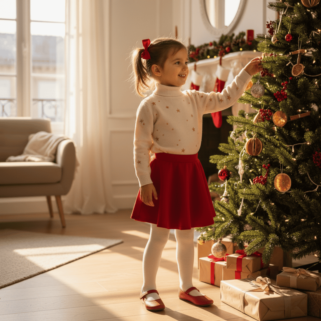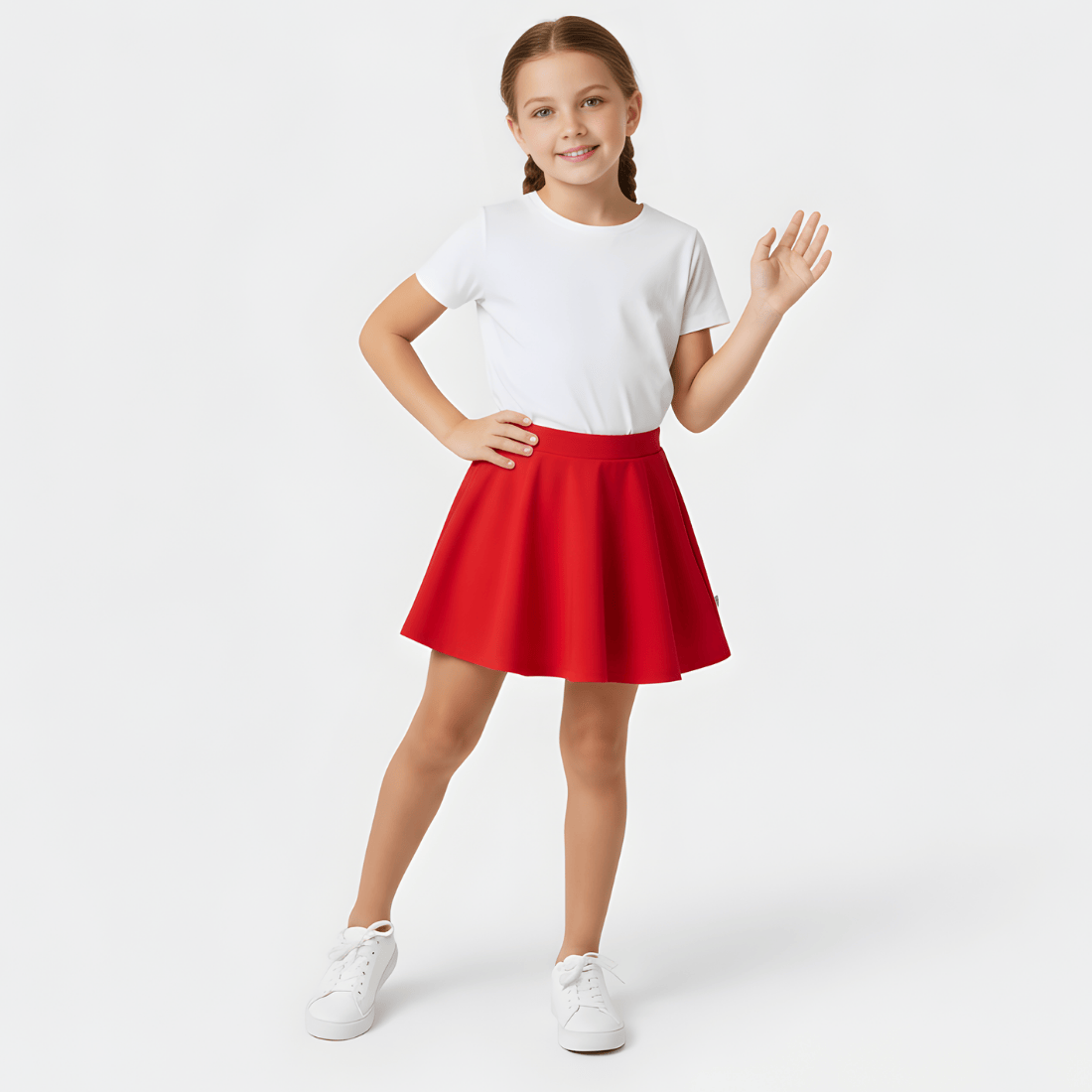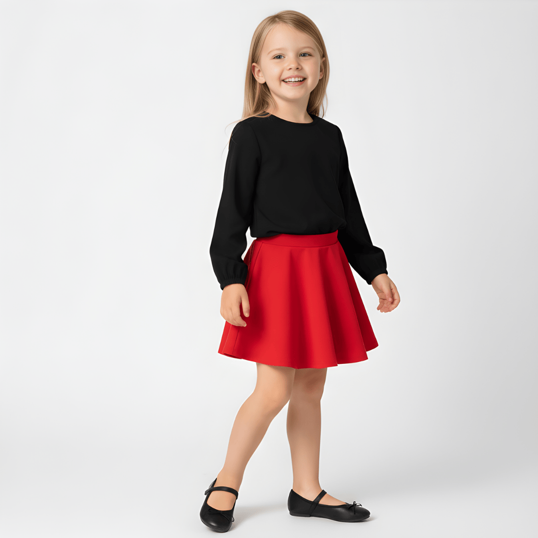 Intensywna czerwień sprawia, że spódnica doskonale pasuje do jednolitych bluzeczek i eleganckich sweterków — to świetny wybór na urodziny, rodzinne spotkania, szkolne występy czy sesję zdjęciową w świątecznym stylu.