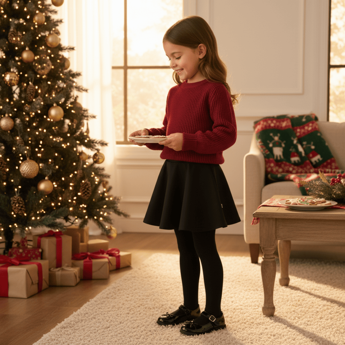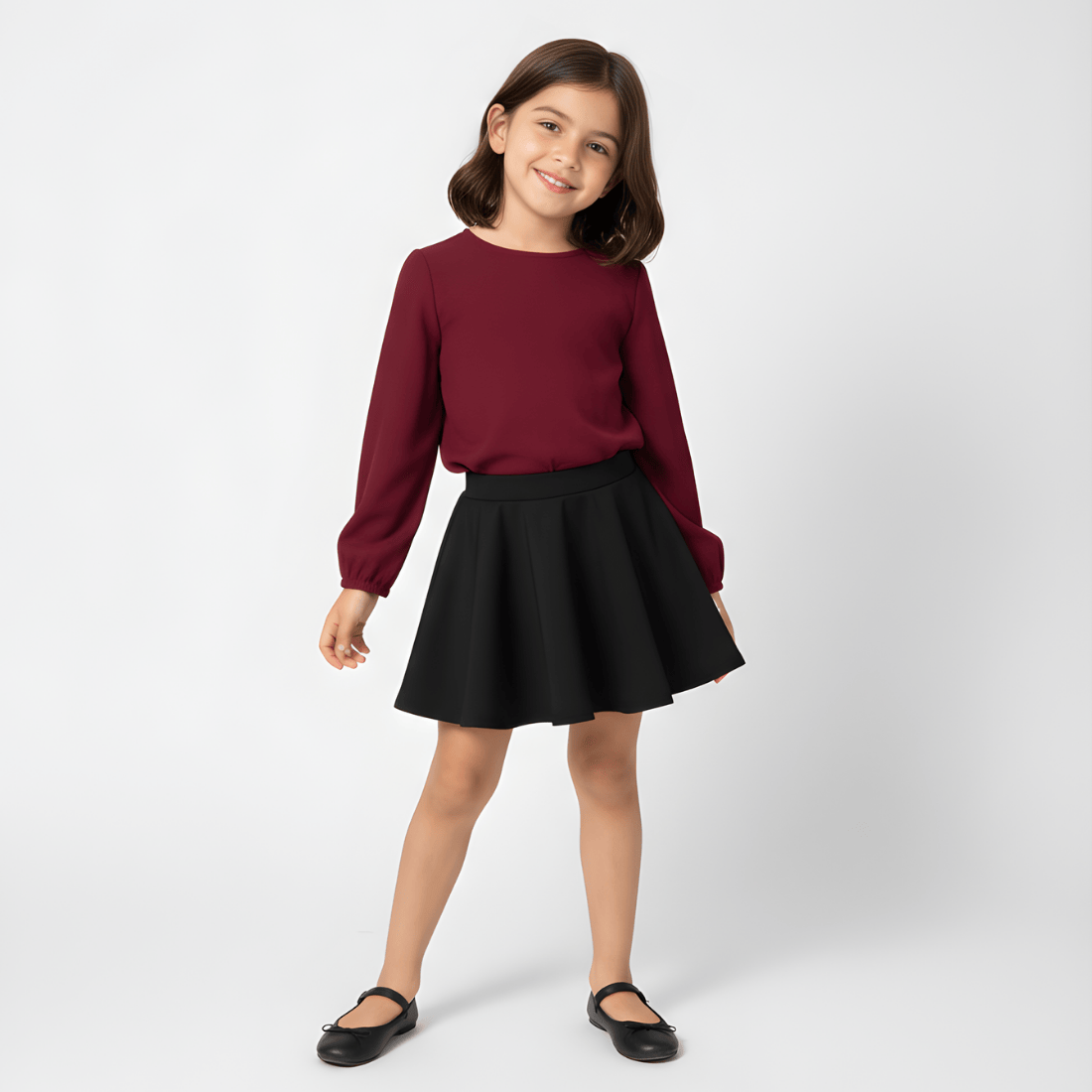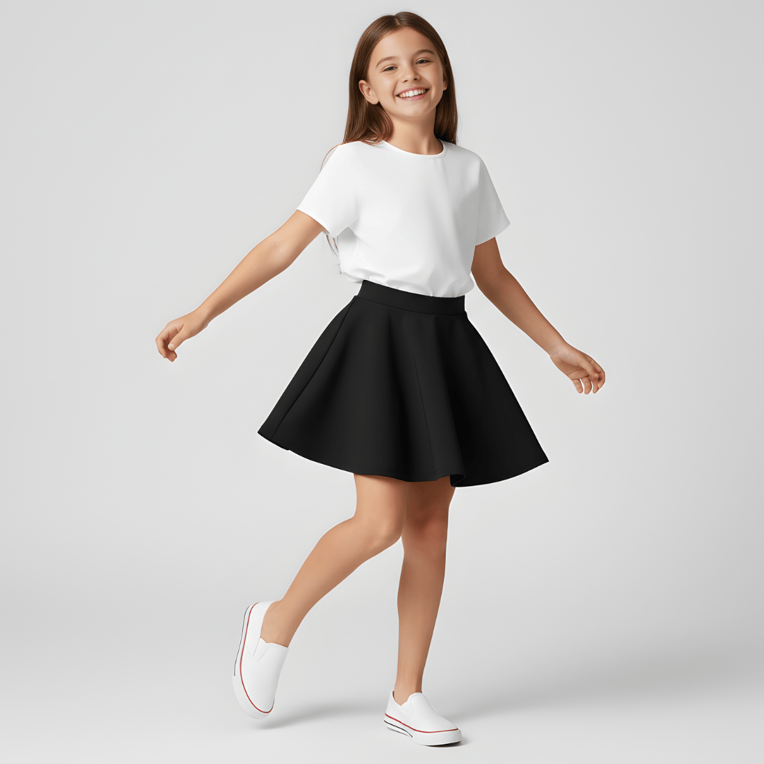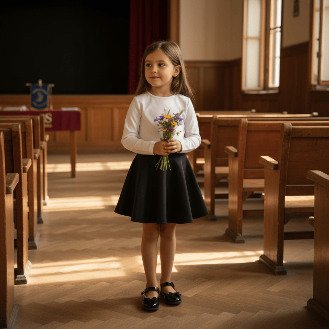 To rozkloszowana spódnica dla dziewczynki, która sprawdzi się na każdą okazję — od codziennych spacerów, po rodzinne uroczystości, urodziny i świąteczne spotkania. Klasyczna, elegancka, a jednocześnie bardzo wygodna.