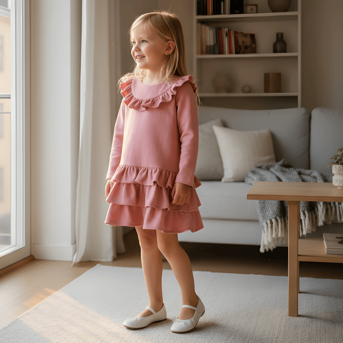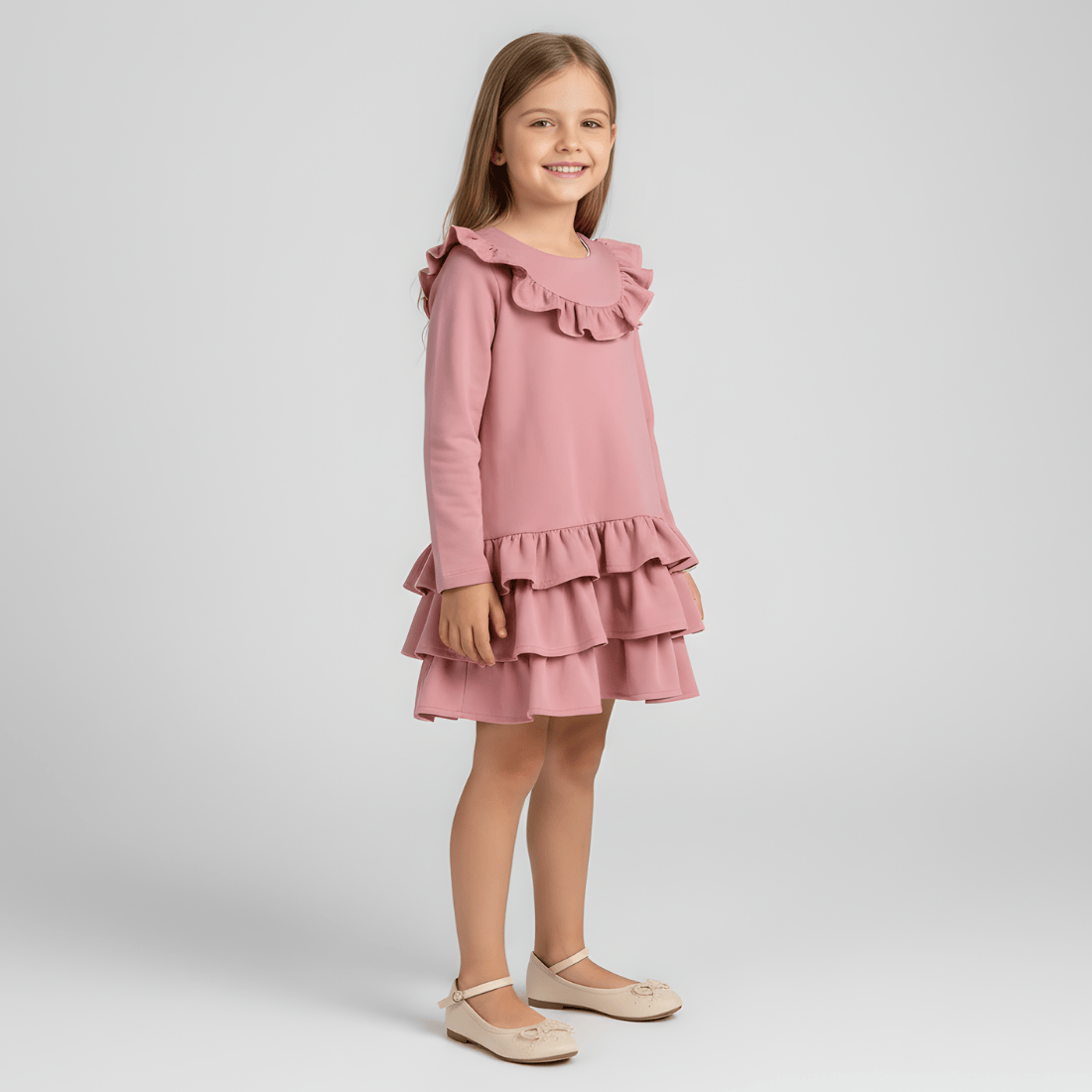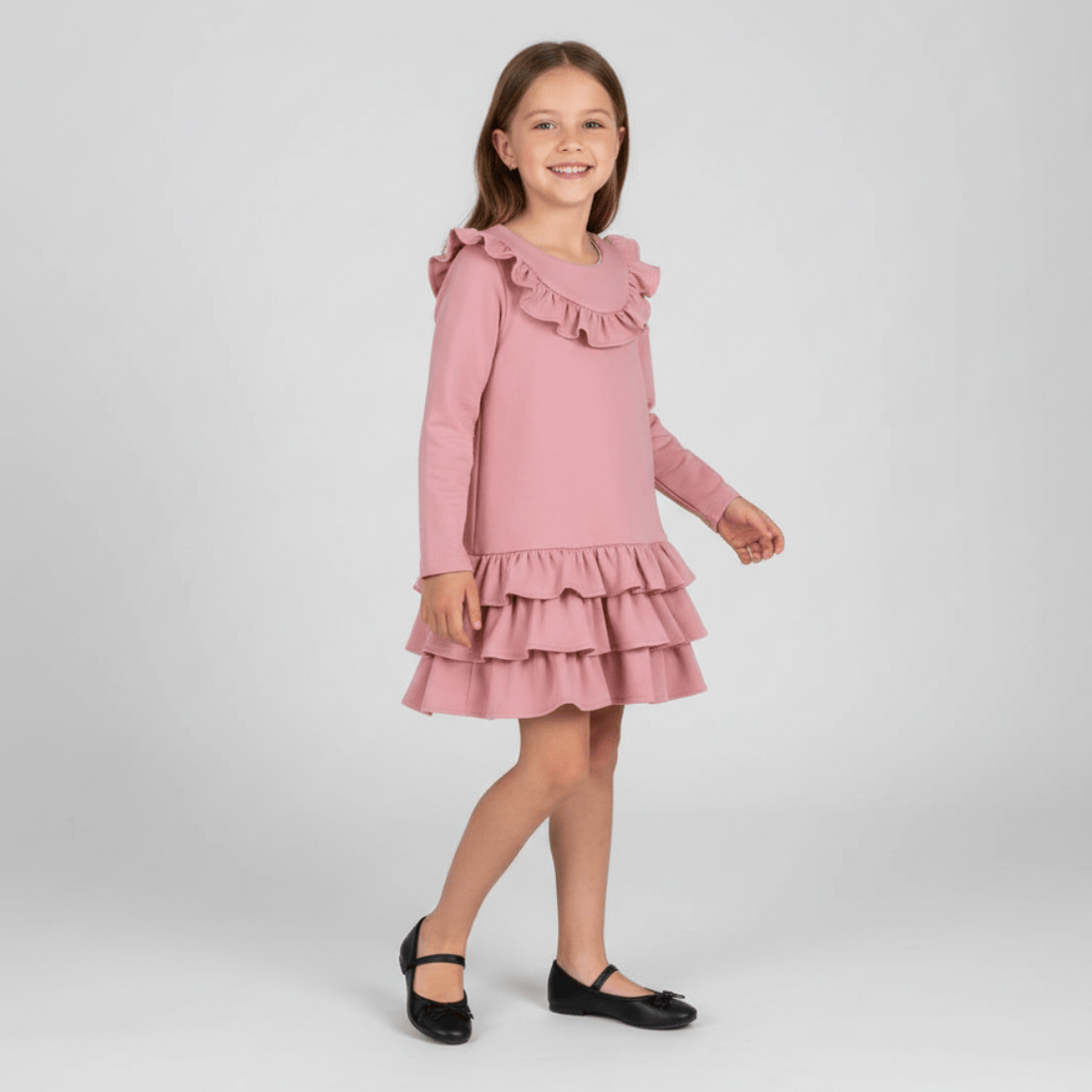 Sukienka w kolorze zgaszonego różu to delikatna, dziewczęca propozycja idealna na uroczystości, rodzinne spotkania, święta oraz codzienne, eleganckie stylizacje. Została uszyta w Polsce z miękkiej, elastycznej bawełny, która zapewnia pełen komfort noszenia i świetnie dopasowuje się do ruchów dziecka.