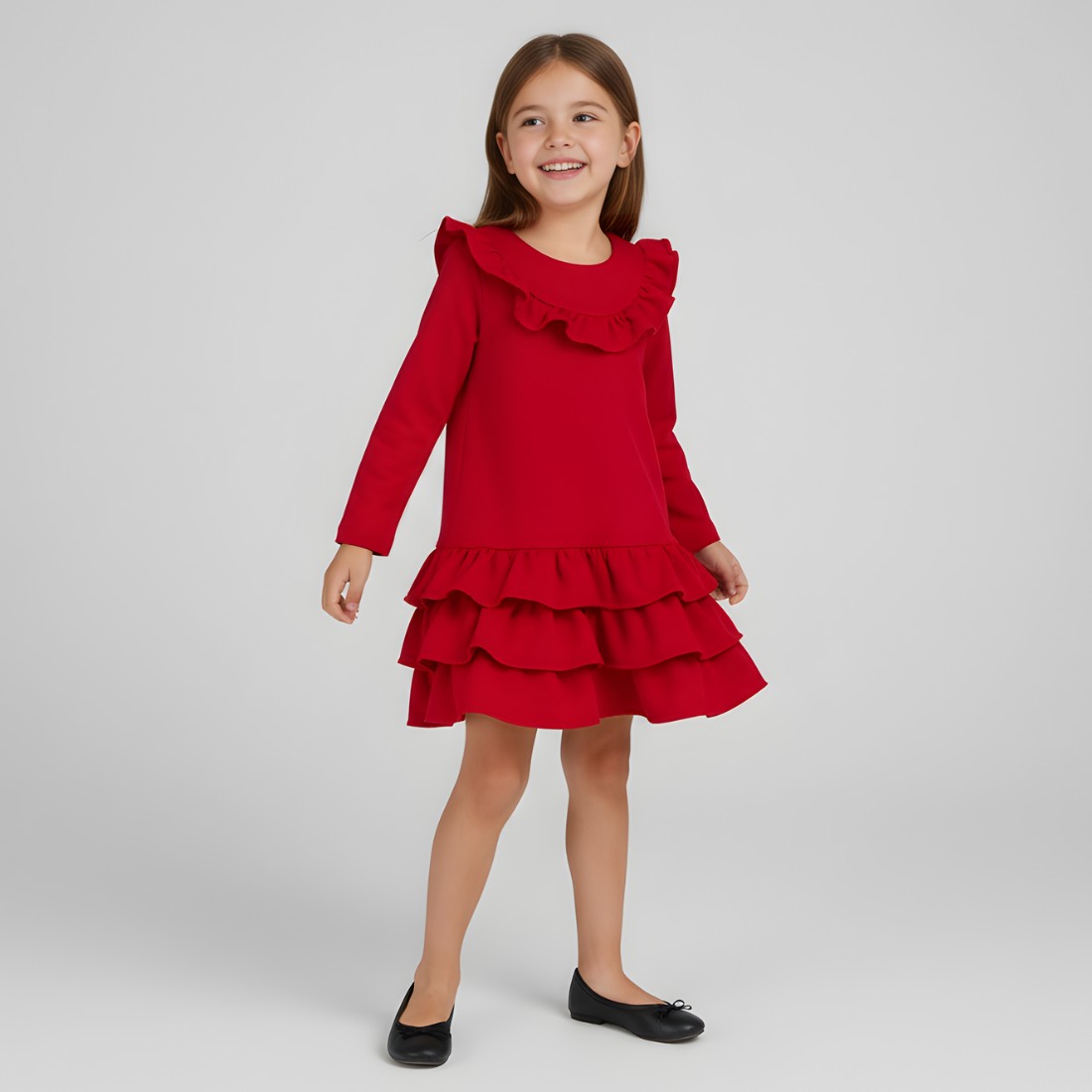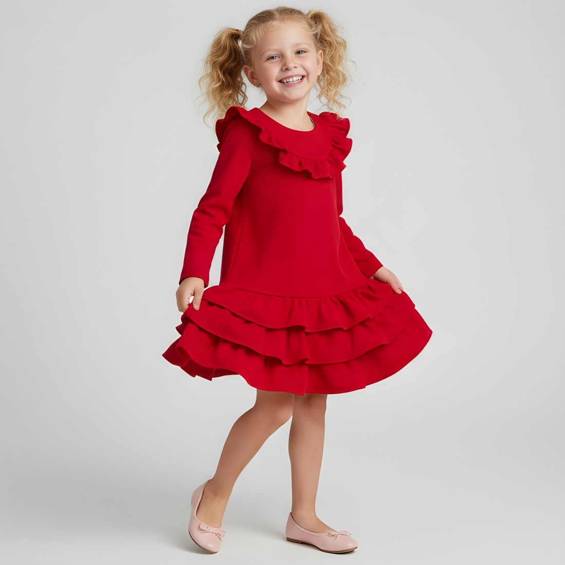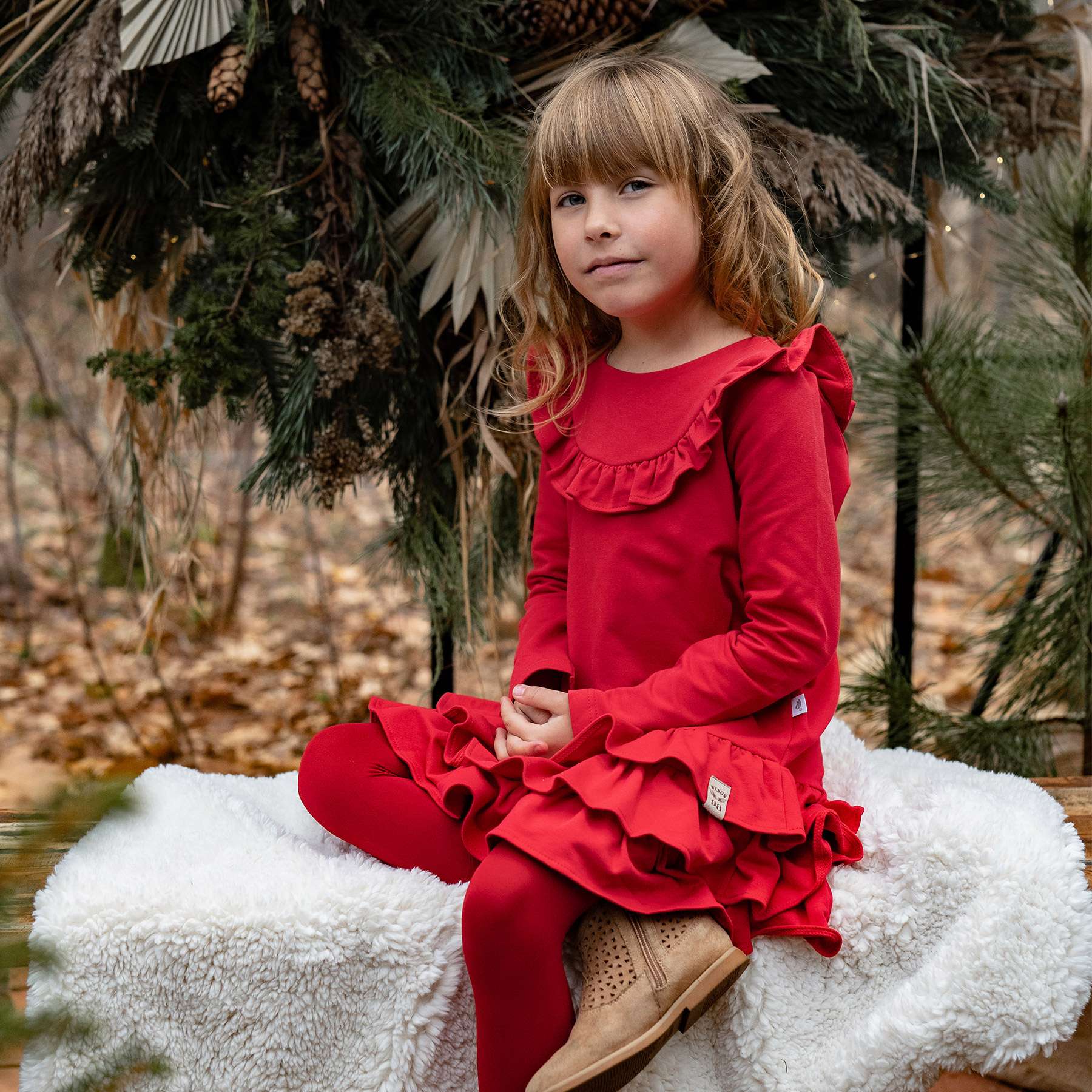 Czerwona sukienka dziewczęca z falbankami to idealna propozycja na święta, ale także na wiele innych, eleganckich okazji. Uszyta w Polsce z mięciutkiej, elastycznej bawełny, jest niezwykle wygodna i przyjemna dla skóry — to model, w którym dziecko będzie czuło się swobodnie przez cały dzień, niezależnie od tego, czy czeka je uroczystość, występ czy rodzinne spotkanie.