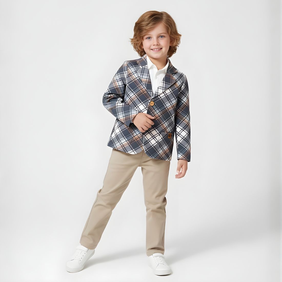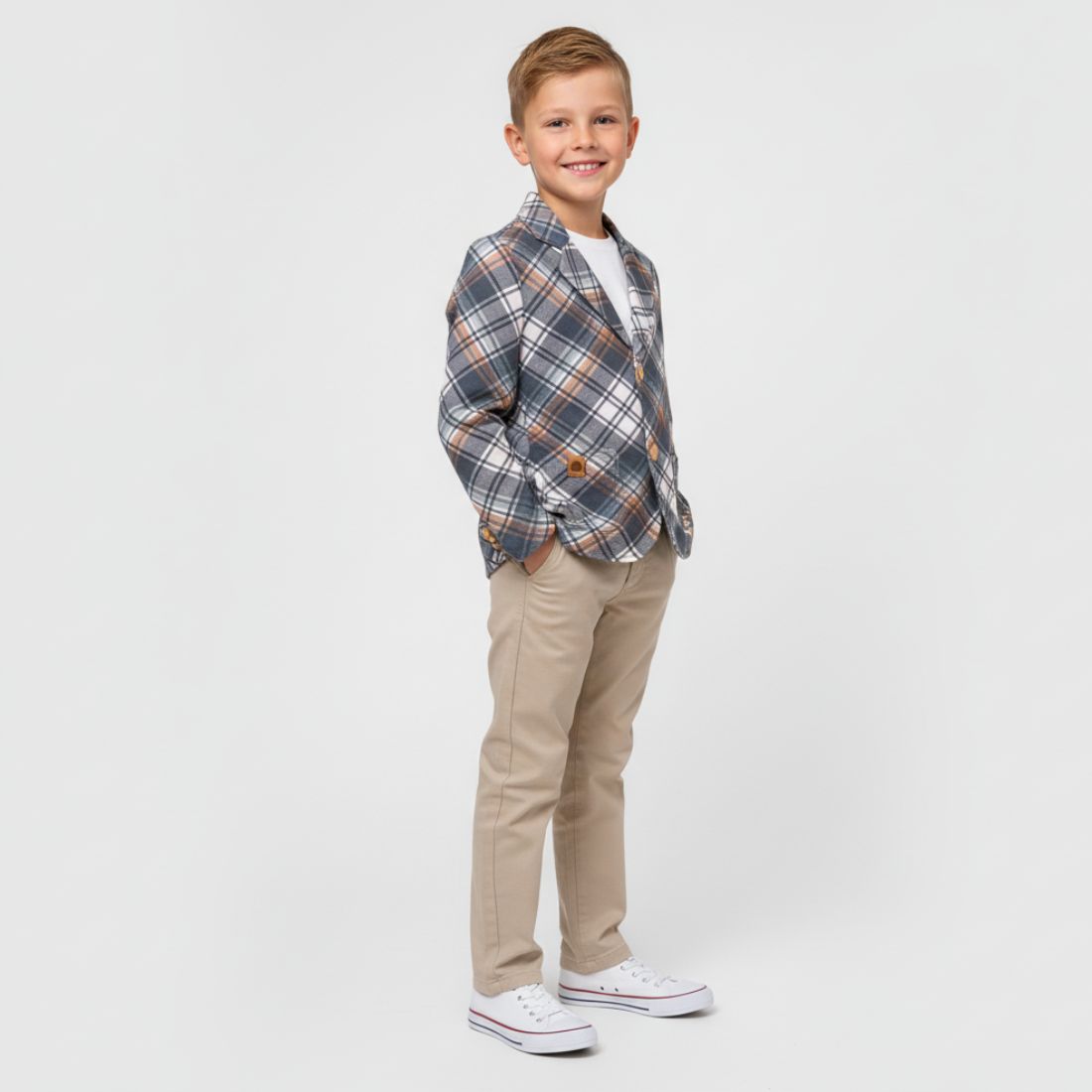 Marynarka chłopięca w klasyczną niebieko-beżową kratę, to idealna propozycja dla małych elegantów, którzy lubią wyglądać wyjątkowo, ale cenią wygodę. Uszyta w Polsce z miękkiej i przewiewnej bawełny, zapewnia komfort nawet podczas całego dnia uroczystości. To świetny wybór na rodzinne spotkania, święta, sesje zdjęciowe czy szkolne akademie.