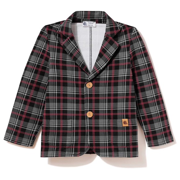Marynarka chłopięca w czerwono-szarą kratę to klasyka inspirowana szkockim tartanem — elegancka, odświętna i idealna na wyjątkowe okazje. Wyrazisty akcent czerwieni pięknie przełamuje grafit i czerń, tworząc efektowną, wizytową stylizację.