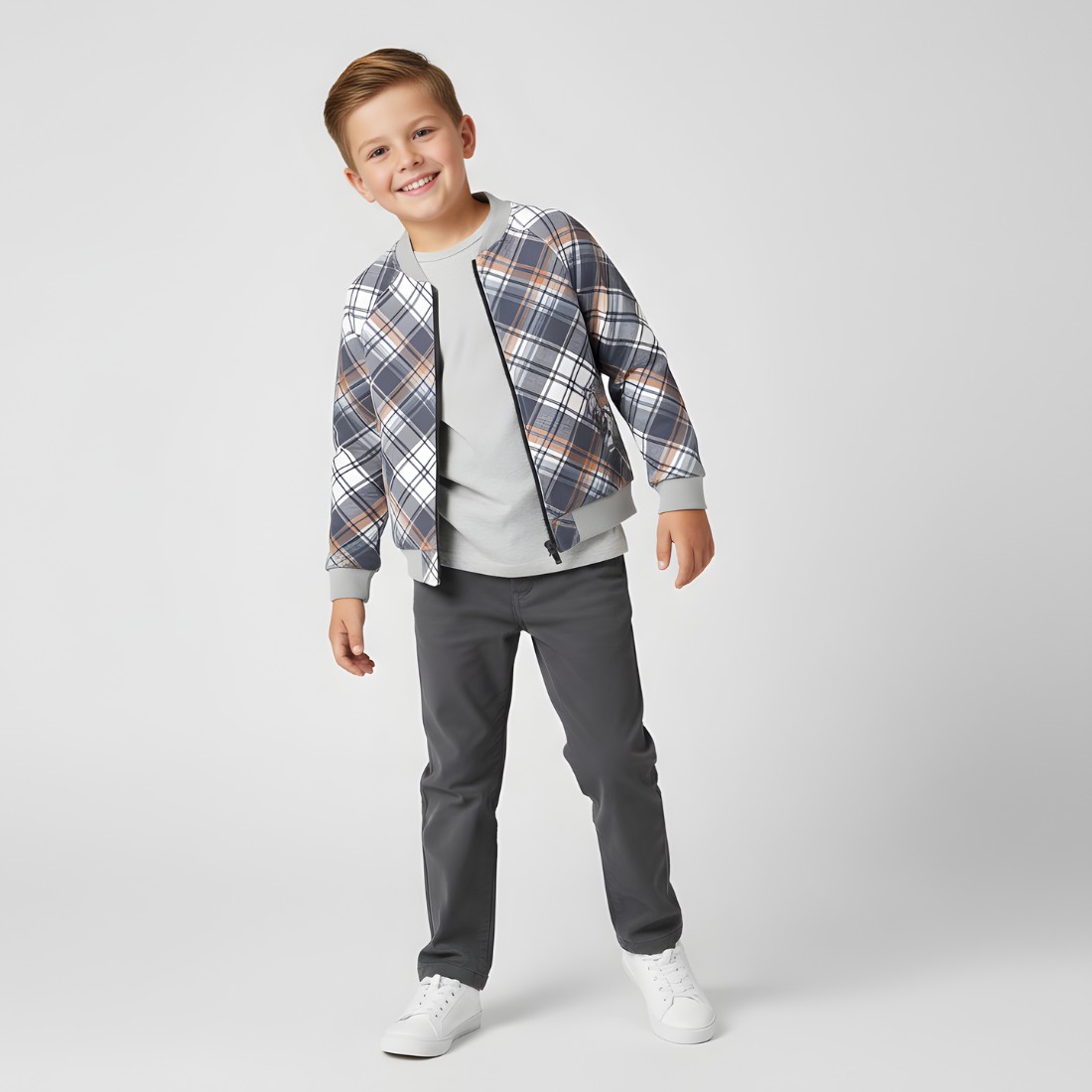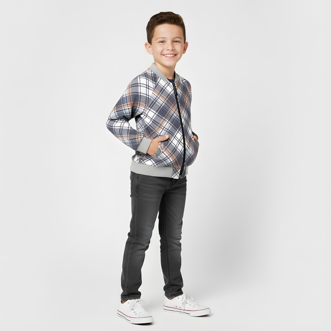 Delikatna kratka w odcieniach niebieskiego i beżu sprawia, że bomberka wygląda stylowo, ale nadal jest bardzo uniwersalna. Można ją zestawić zarówno z klasycznymi spodniami wizytowymi, jak i jeansami czy joggerami. Świetnie sprawdzi się podczas świąt, przedszkolnych występów, sesji zdjęciowych i wspólnych wyjść.