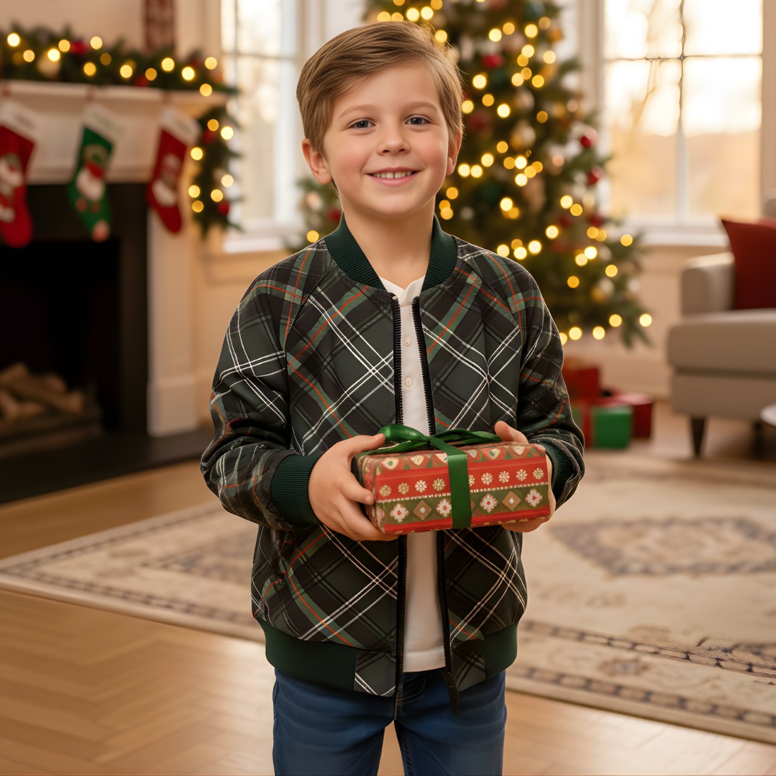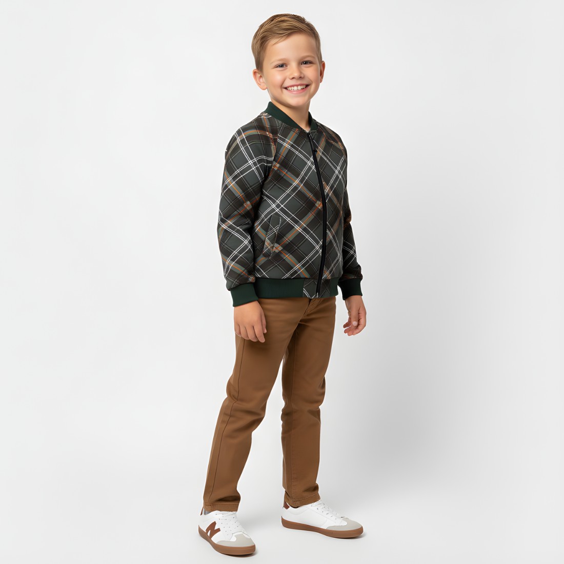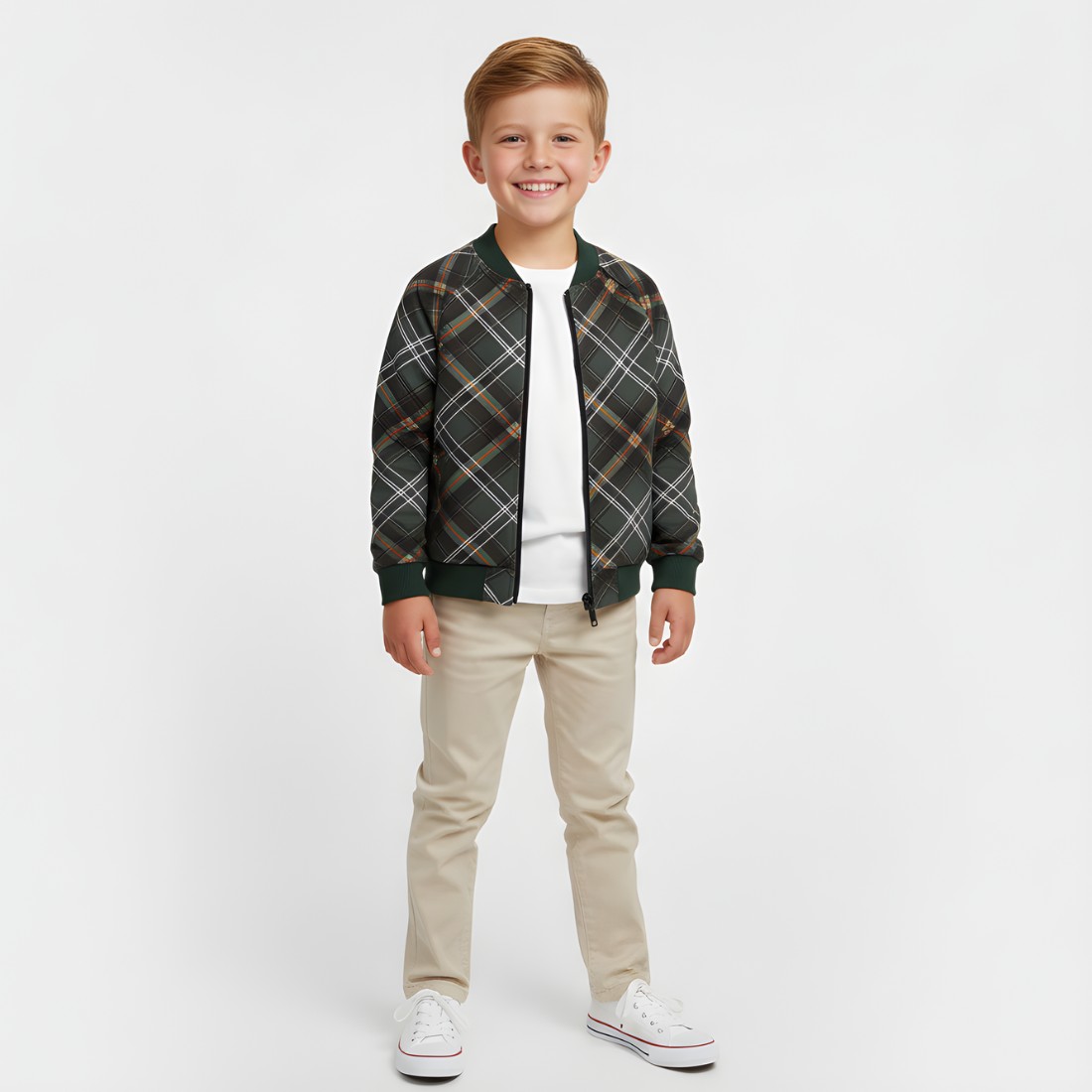 Bomberka chłopięca w piękną, klasyczną kratę to wyjątkowo szlachetny, jesienny wzór, idealny na rodzinne spotkania, świąteczne sesje zdjęciowe i wszystkie eleganckie okazje. Zielona krata tworzy wzór w ponadczasowym stylu, który pasuje do różnych typów stylizacji — od koszul po gładkie t-shirty.