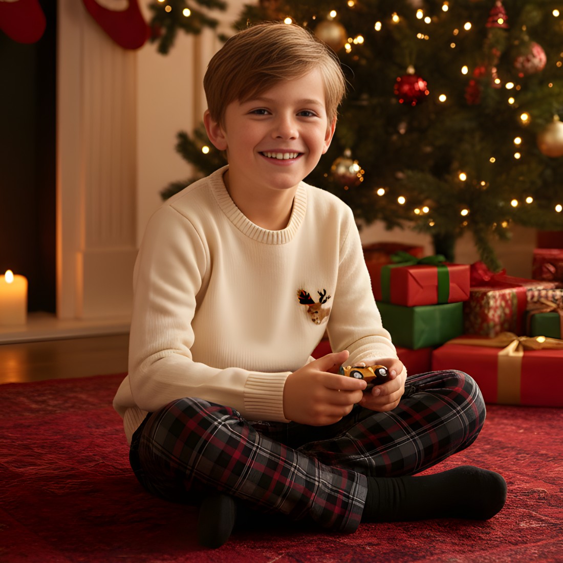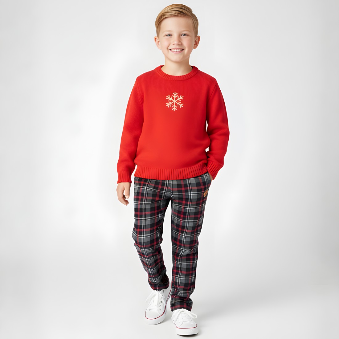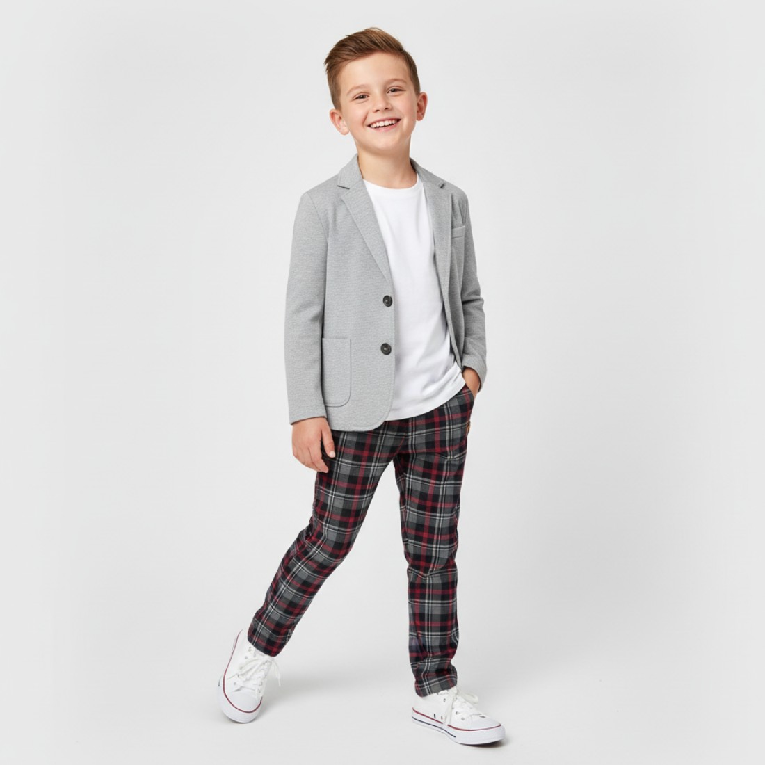 Spodnie chłopięce w elegancką kratę to klasyczna propozycja inspirowana szkockim tartanem — idealne na święta, ważne uroczystości i eleganckie stylizacje. Wyrazista, grafitowo-czerwona kratka prezentuje się bardzo efektownie, a jednocześnie jest na tyle uniwersalna, że z łatwością dopasujesz do niej koszulę, sweterek lub gładki t-shirt.