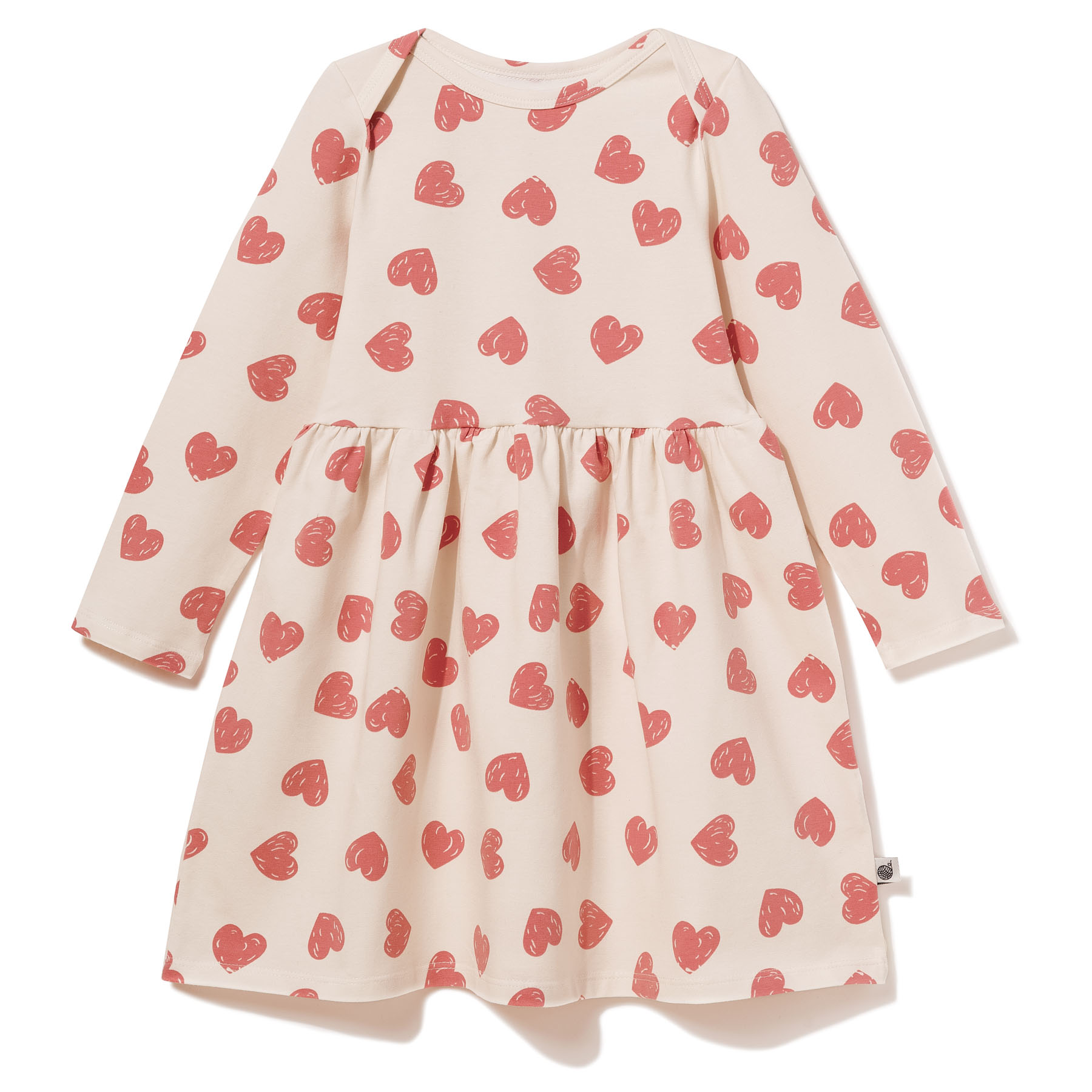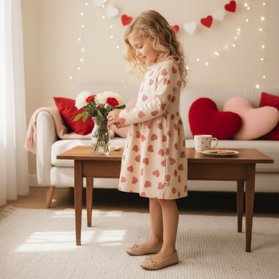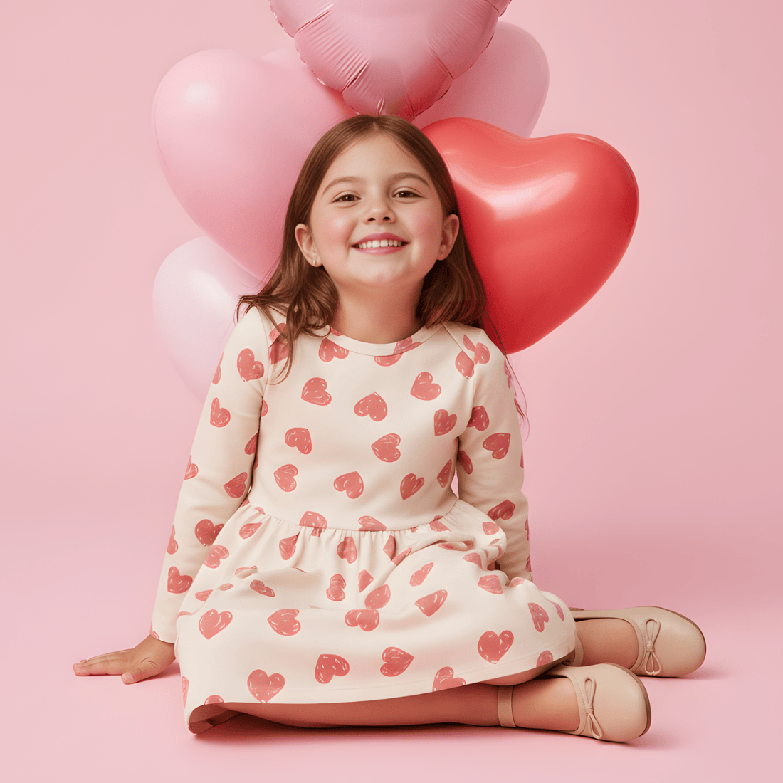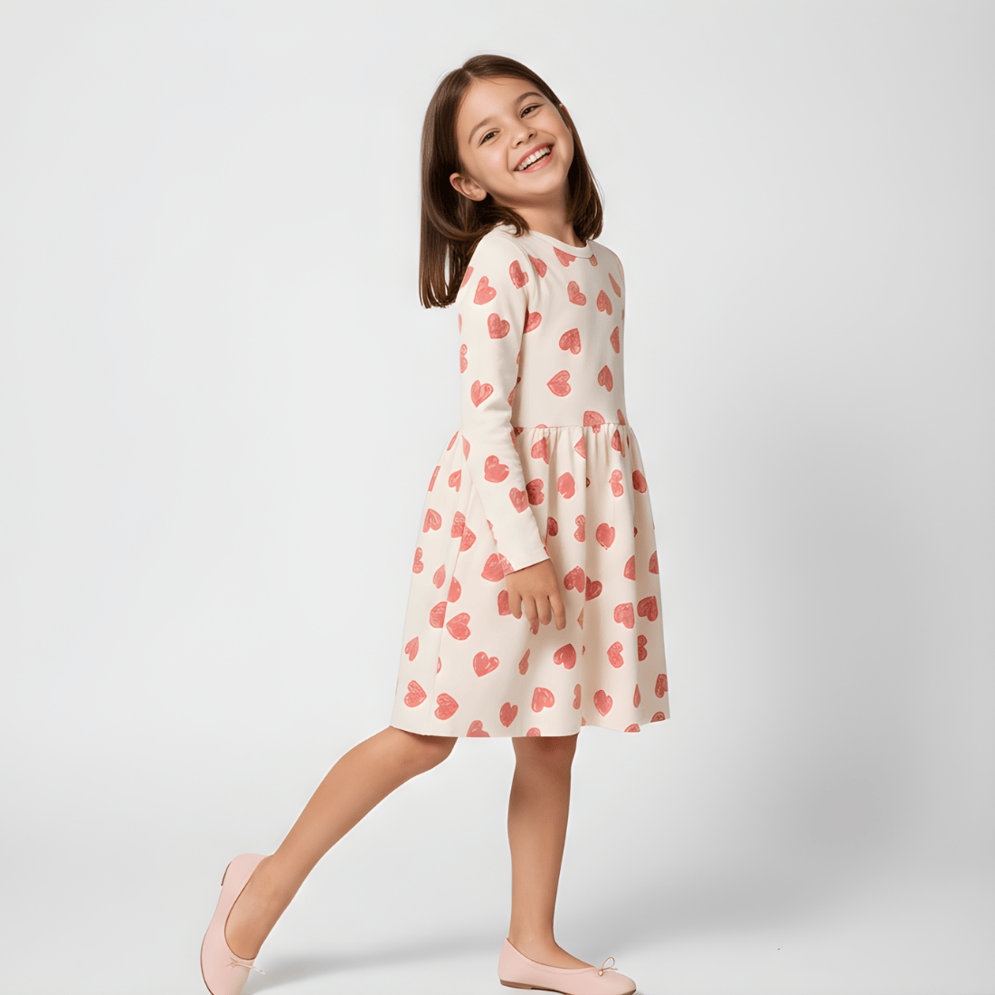 Śmietankowe tło ozdobione drobnym wzorem serduszek nadaje całości subtelnego, romantycznego charakteru. To idealna sukienka na Walentynki, rodzinne uroczystości, przedszkolne wyjścia czy codzienne stylizacje, gdy chcesz połączyć wygodę z eleganckim wyglądem.